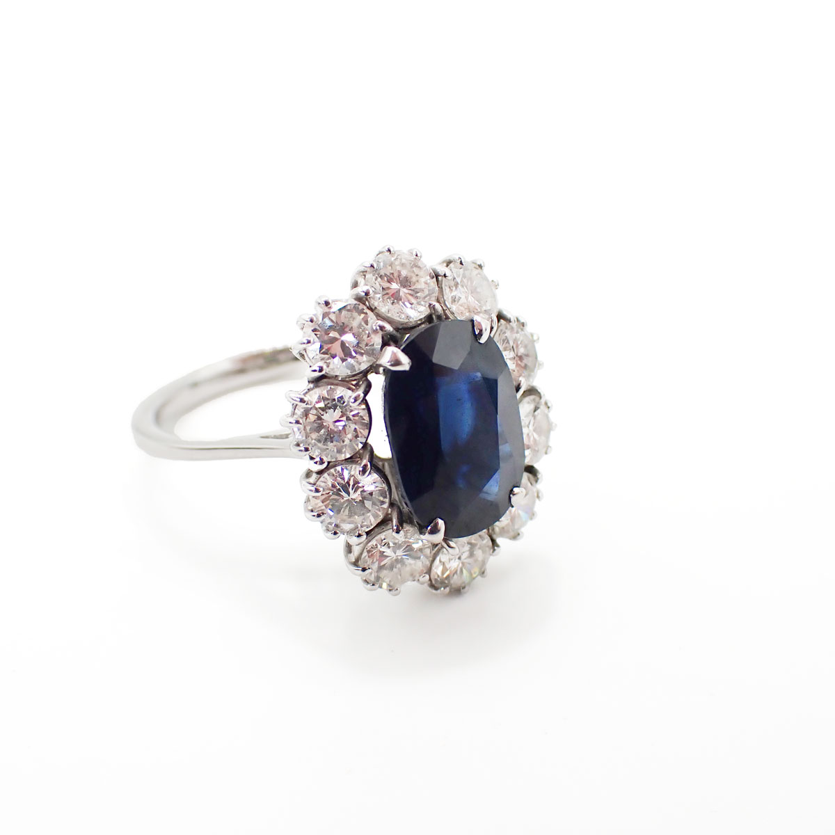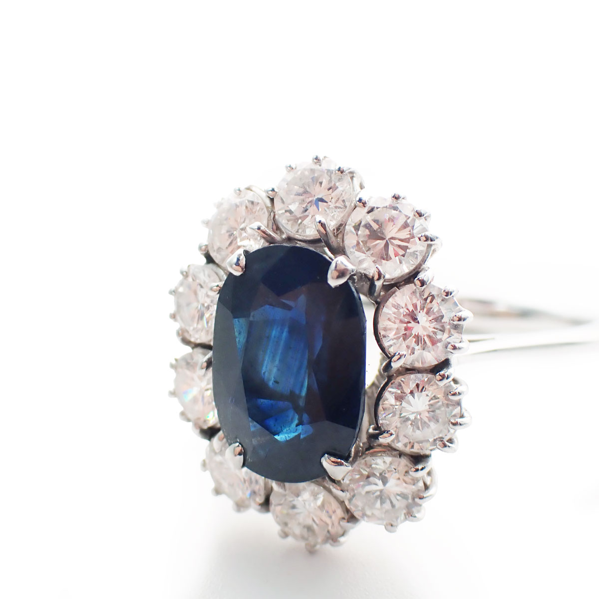 Anello a margherita in oro bianco 750 con zaffiro centrale australiano di circa 3,2 ct contornato da diamanti rotondi taglio a brillante per un peso complessivo di circa 1,70 ct