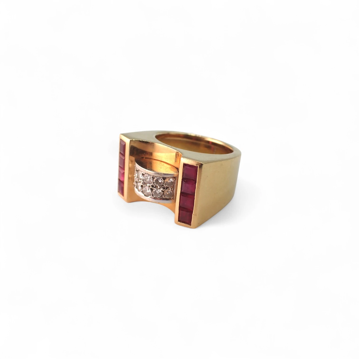 Anello in oro giallo e platino con diamanti circa 0,20 ct e rubini carrè