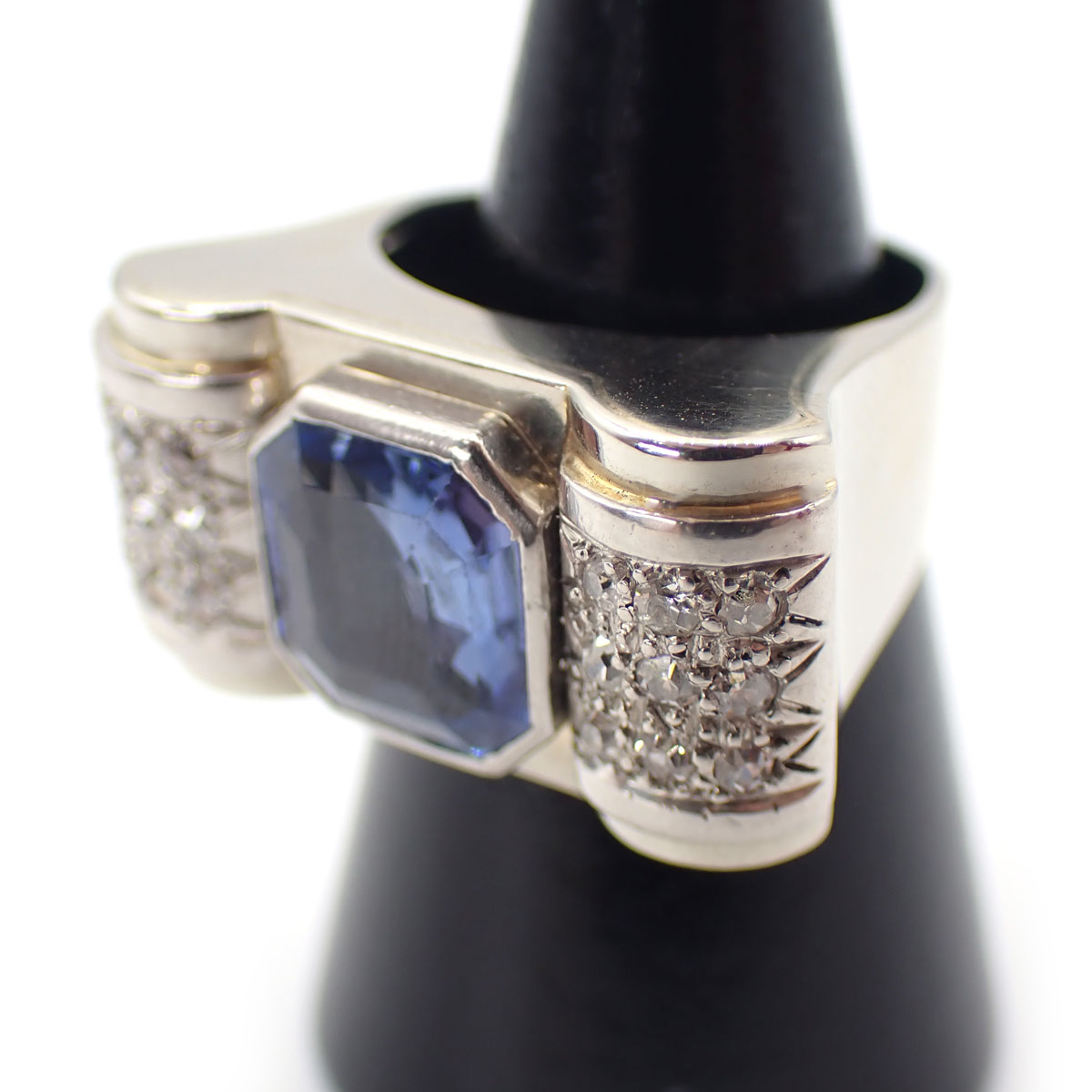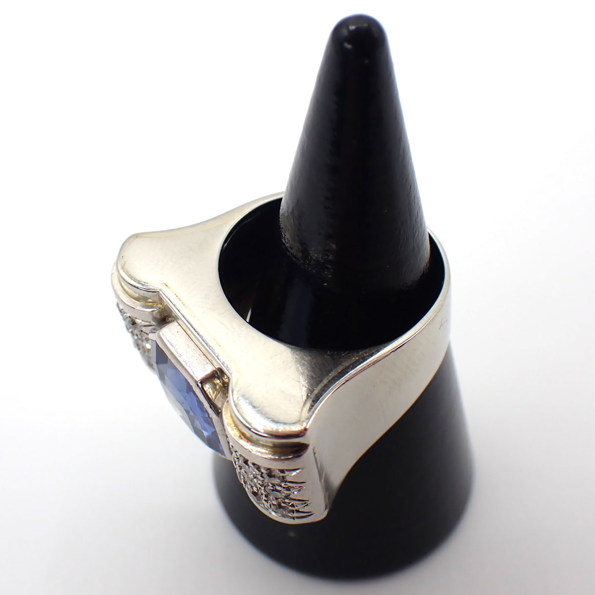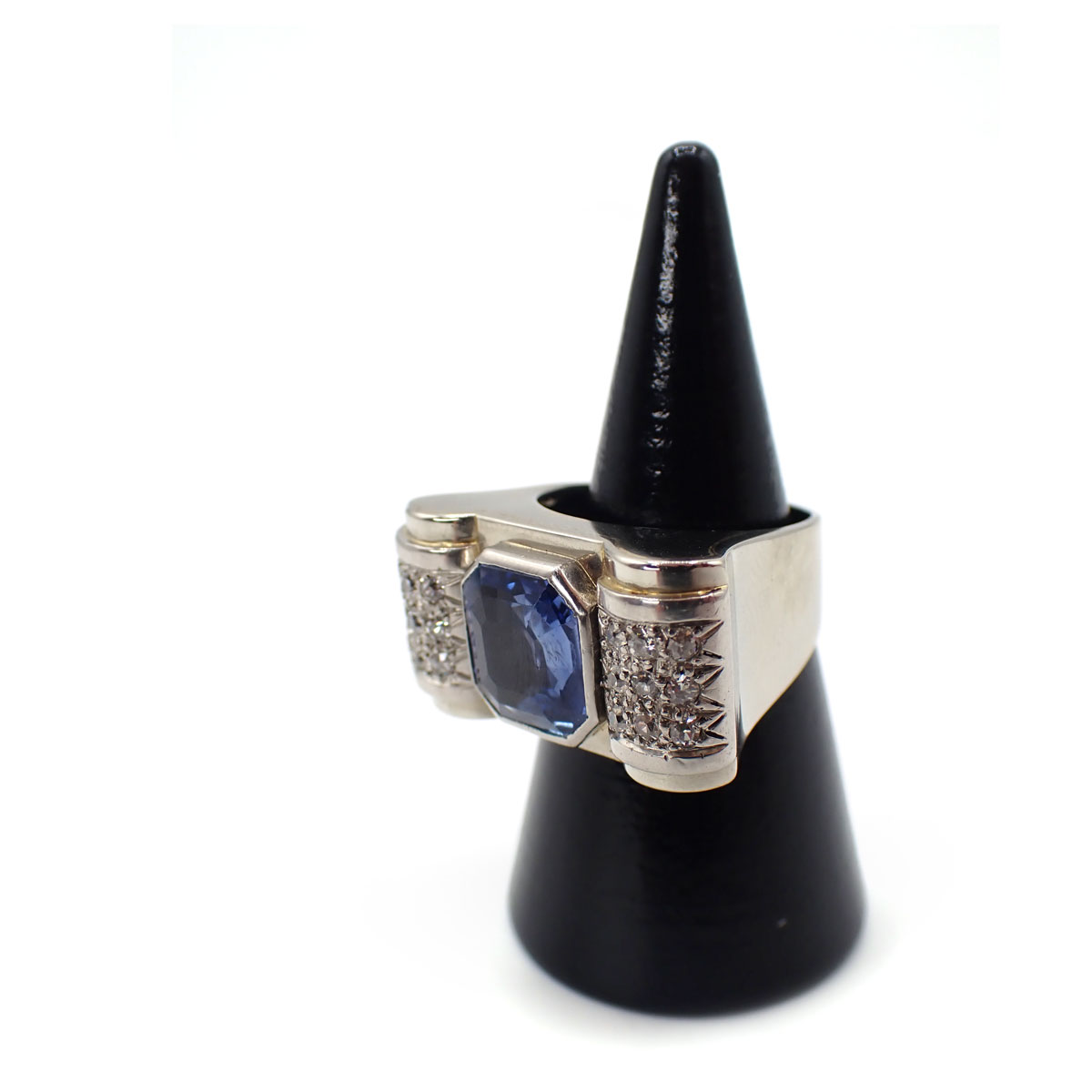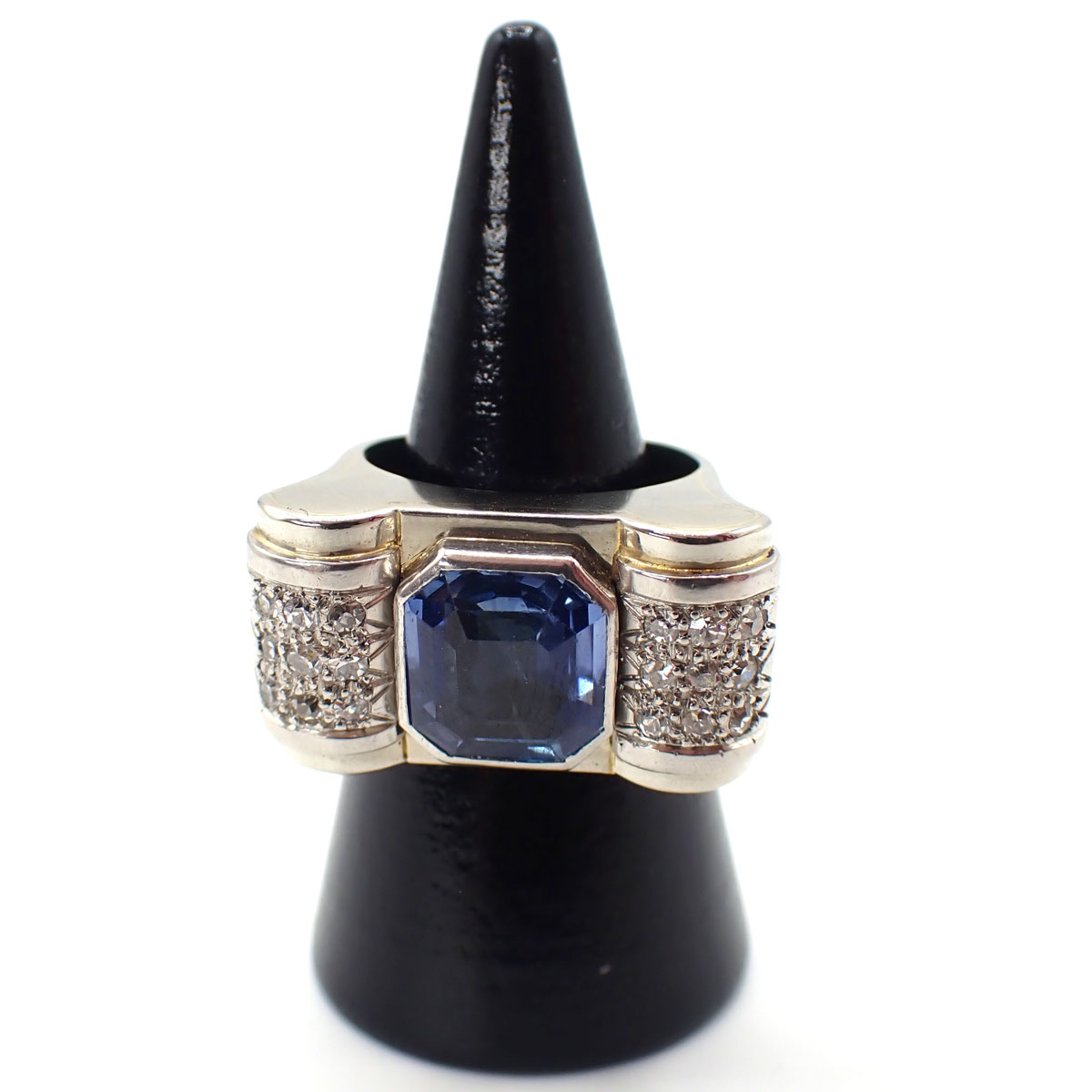 Anello anni 40 a ponte, realizzato in oro e platino di manifattura francese. Zaffiro ottagonale Ceylon (senza evidenze da trattamento termico) da circa 3,75 ct e diamanti laterali taglio huit huit da circa 0,50 ct.