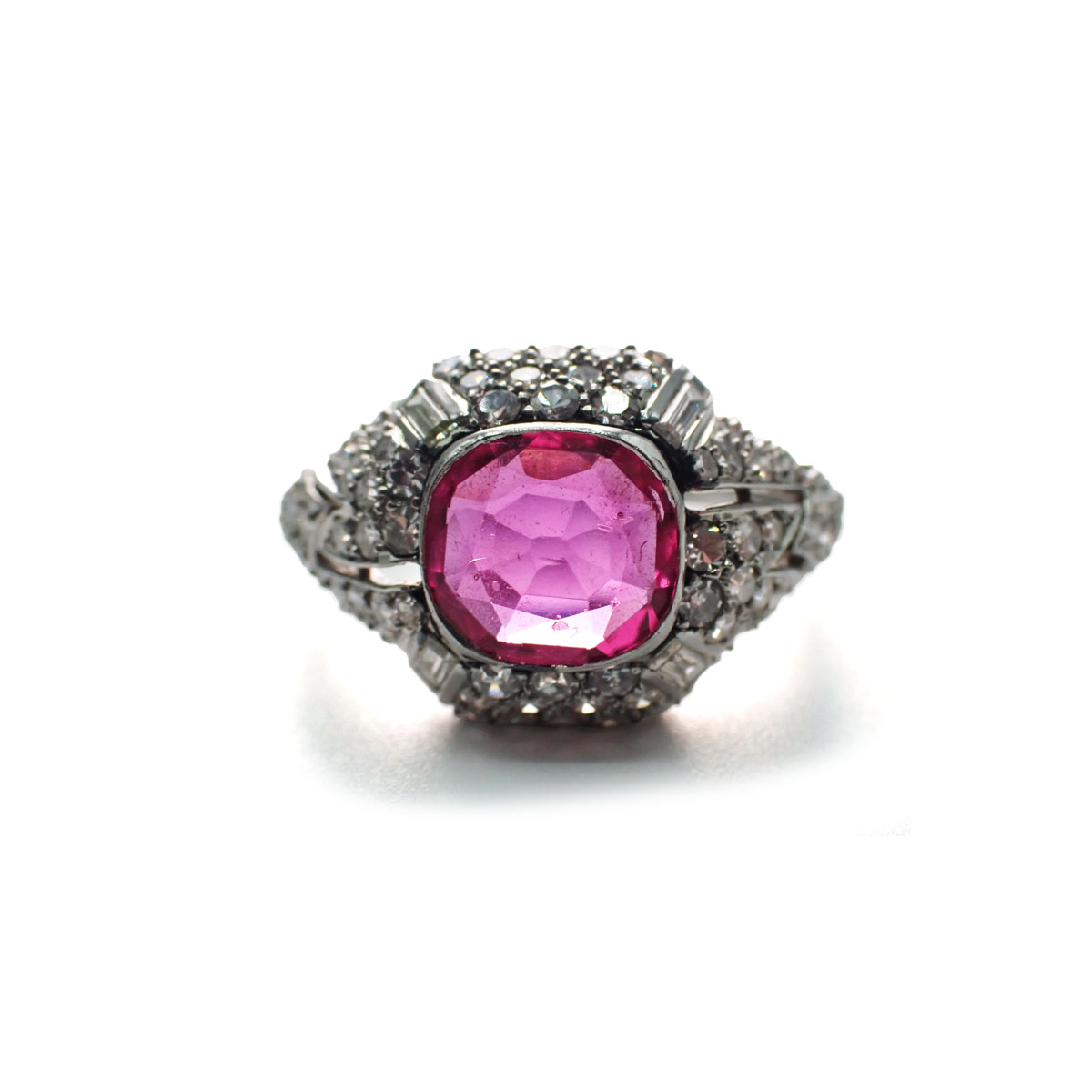 Anello Decò in platino con rubino birmano, senza evidenze da trattamento termico, a cuscino di circa 1,20 ct contornato da pavè di diamanti taglio huit huit e a baguette.