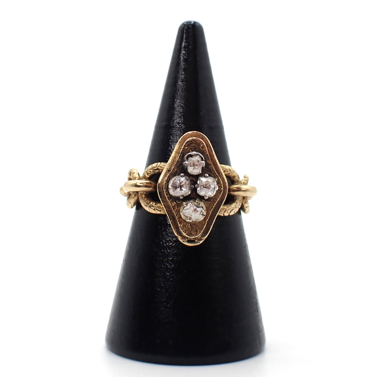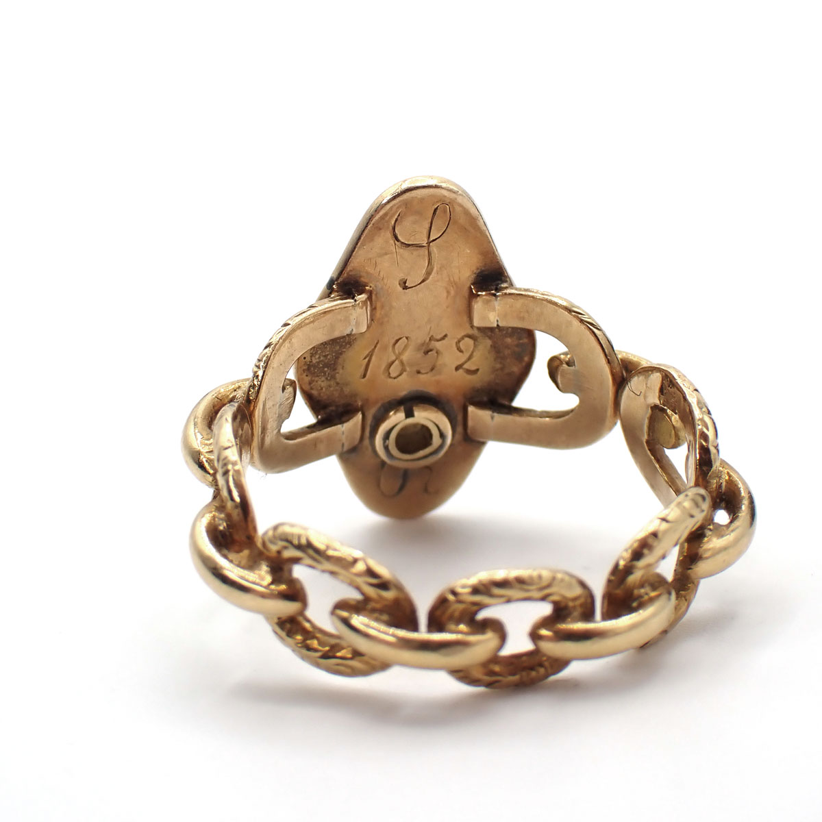 Anello di fidanzamento in oro giallo 750 con diamanti taglio antico del peso complessivo di circa 0,35 ct. Sul retro sono incise due iniziali e la data 1852.