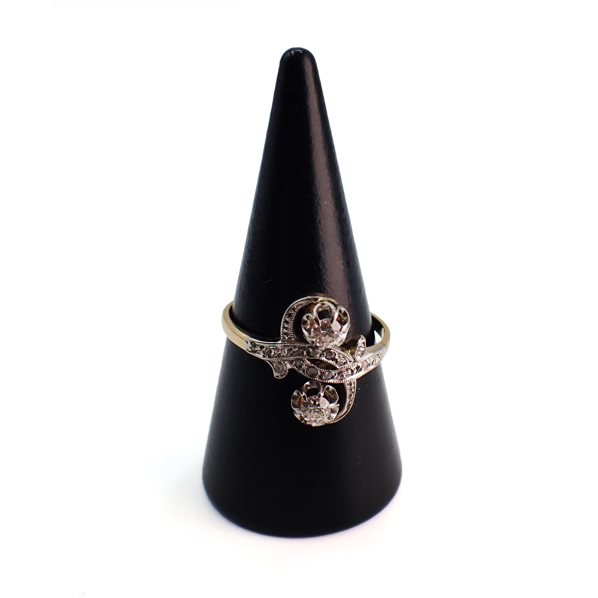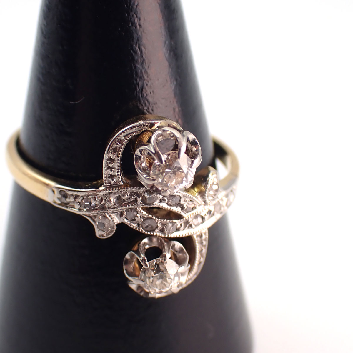Anello d’epoca Toi & Moi di produzione francese in oro giallo 750 e platino con diamanti taglio antico per un peso complessivo di circa 0,25 ct
