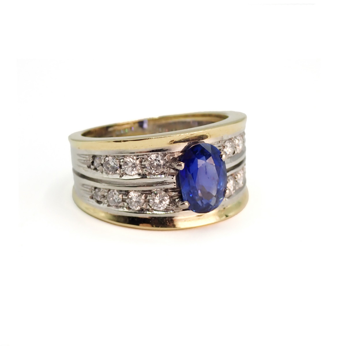 Anello fascia in oro giallo con zaffiro ovale di circa 1,40 ct e diamanti rotondi taglio a brillante del peso di circa 0,40 ct