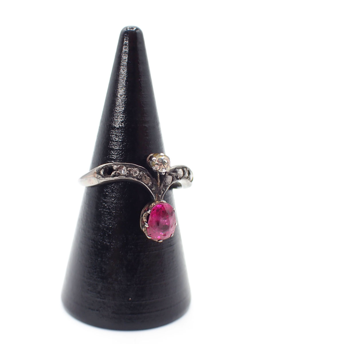 Anello liberty in oro giallo a basso titolo e argento con rubino Birmano (senza evidenze di trattamento termico) da circa 1 ct e diamanti taglio antico.