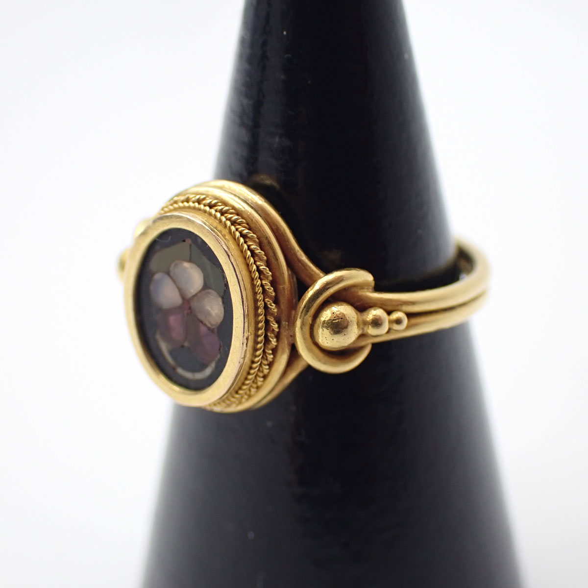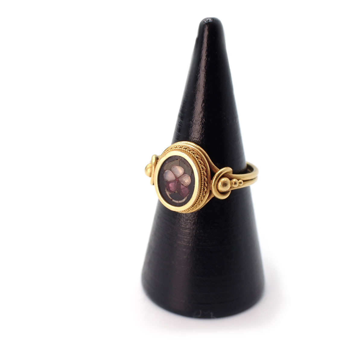 Anello in oro giallo 750 realizzato a filigrana e granulazione con micromosaico a commesso floreale. Realizzato a fine 800.