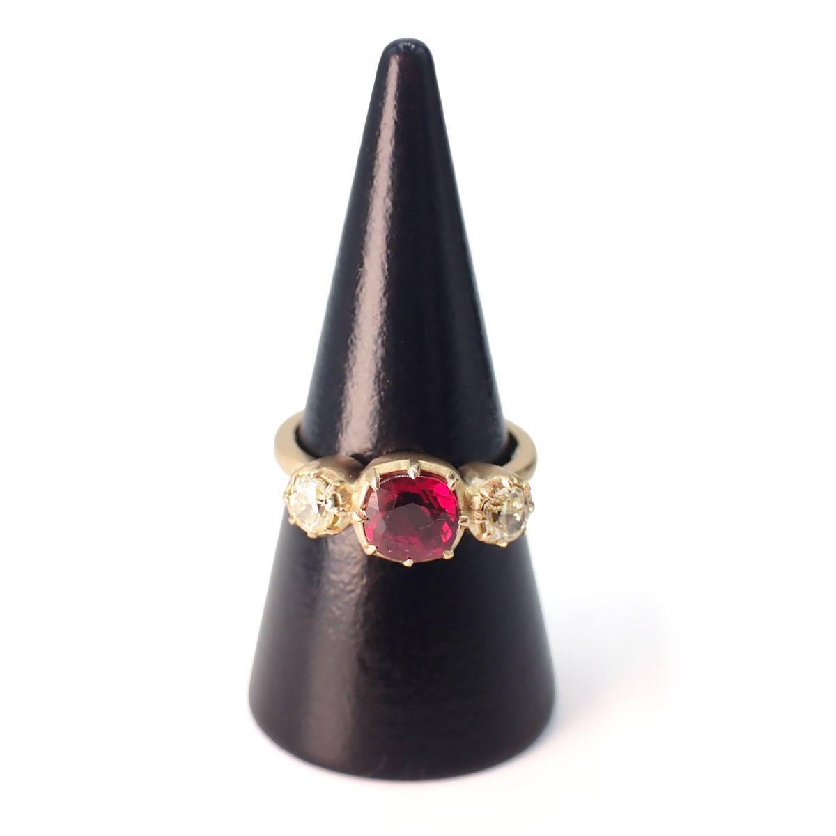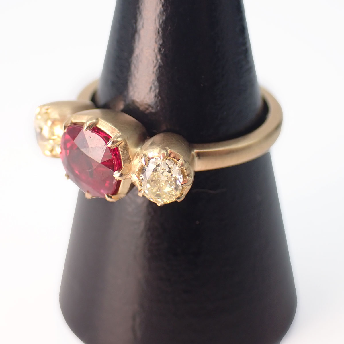 Anello trilogy in oro giallo satinato 750 con rubino centrale a cuscino di circa 1,25 ct e due diamanti ovali lateraly fancy yellow per un peso complessivo di circa 0,45 ct.