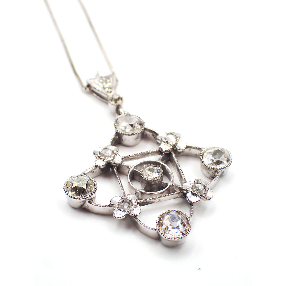 Catenina in oro bianco 750 e pendente floreale in platino con diamanti taglio vecchio per un totale di circa 0,85 ct