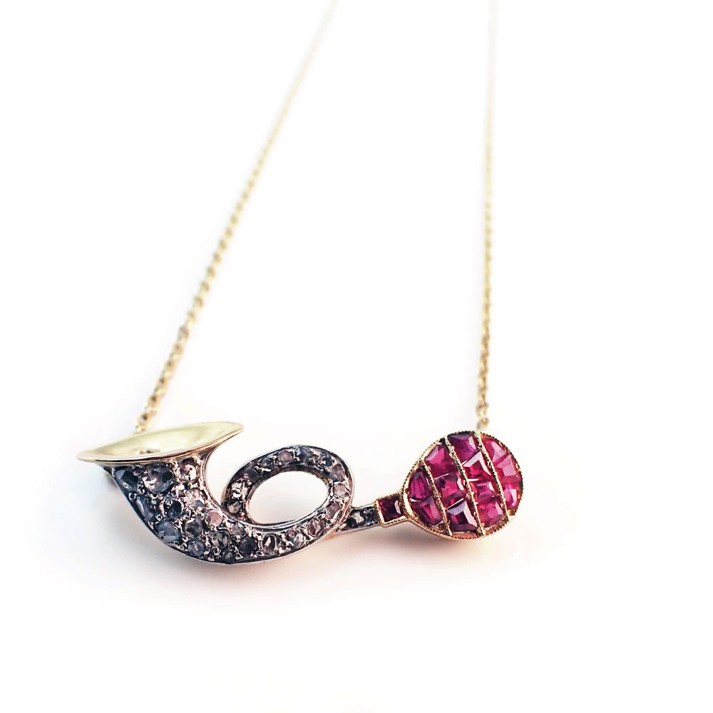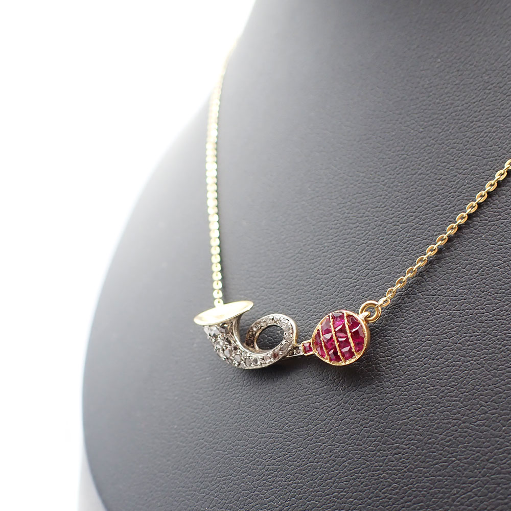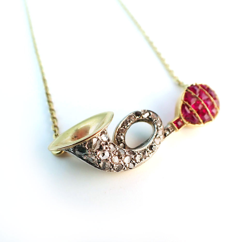 Collana in oro giallo 750 con pendente clacson tromba in oro giallo 750 e argento con diamanti rosetta e rubini sintetici