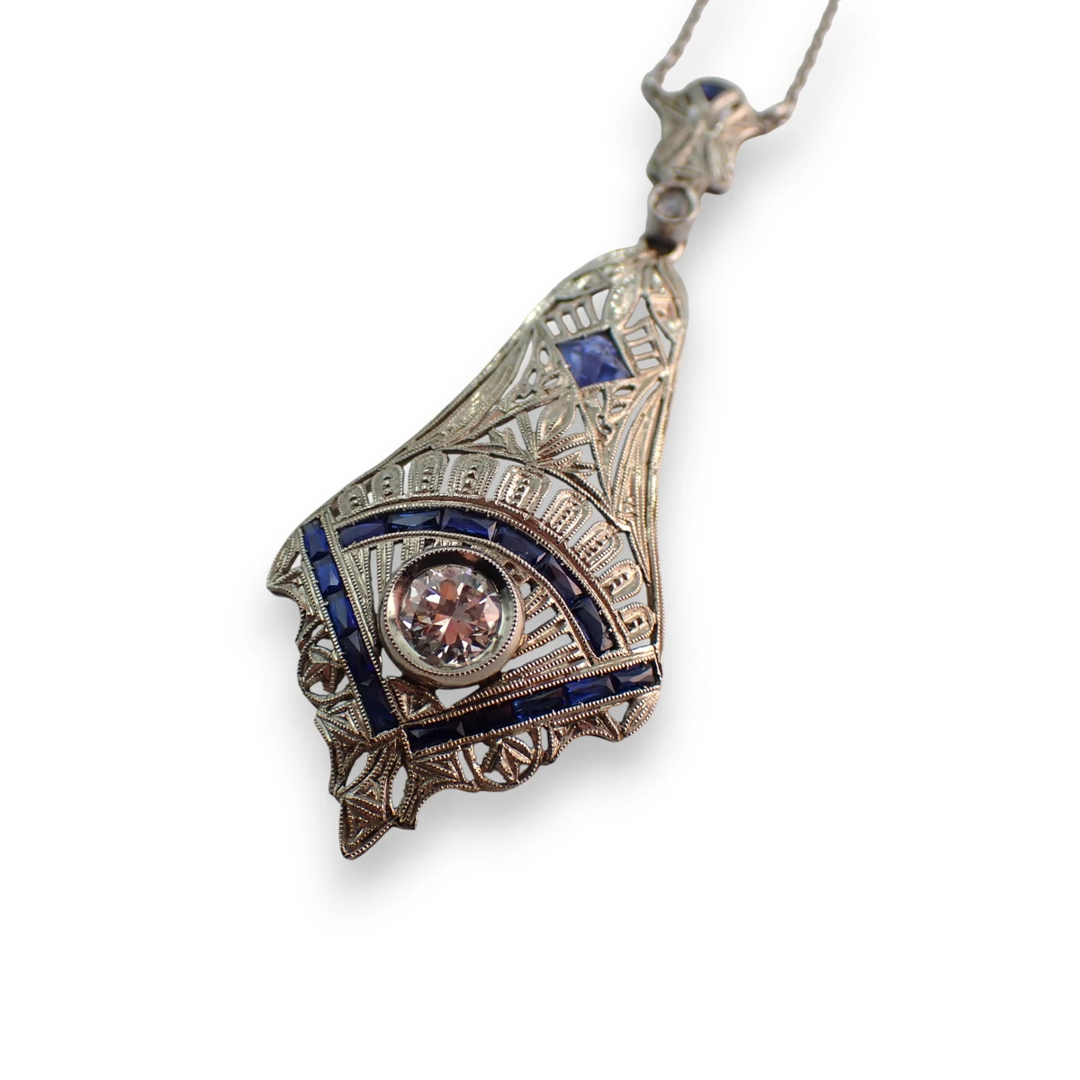 Collana con pendente decò in oro bianco con diamante centrale taglio antico di ct 0,55 circa, diamanti taglio rosetta di contorno e zaffiri sintetici