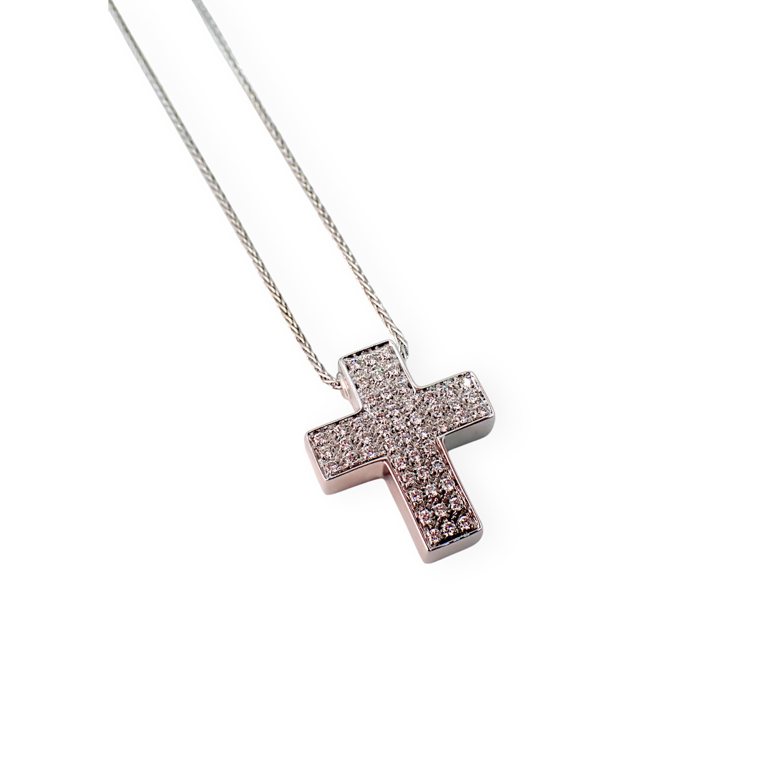Collana in oro bianco con pendente a croce in oro bianco e pavè di diamanti rotondi taglio a brillante circa totali 0,50 ct firmata Salvini