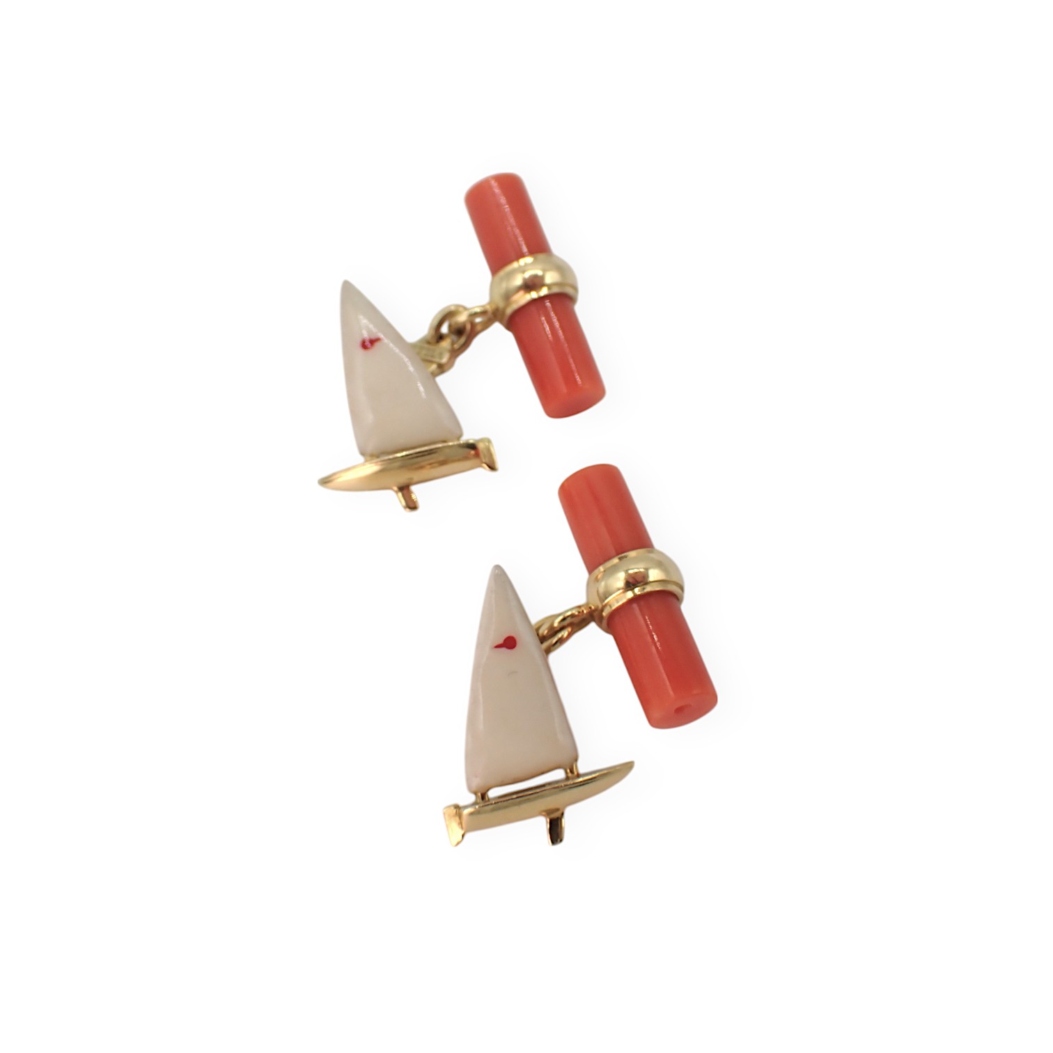 Gemelli a forma di barca vela in oro giallo con coralli e smalti. Realizzati da Villa Milano. Corredati di scatola originale