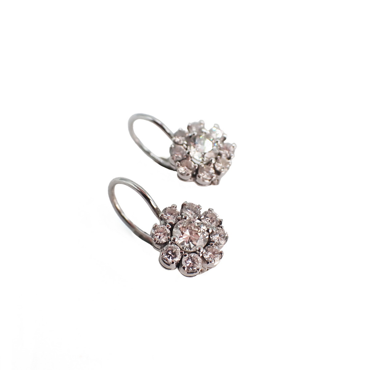 Orecchini a monachella a fiore in oro bianco con diamanti rotondi taglio a brillante e tagli antichi per un peso complessivo di circa 1,05 ct