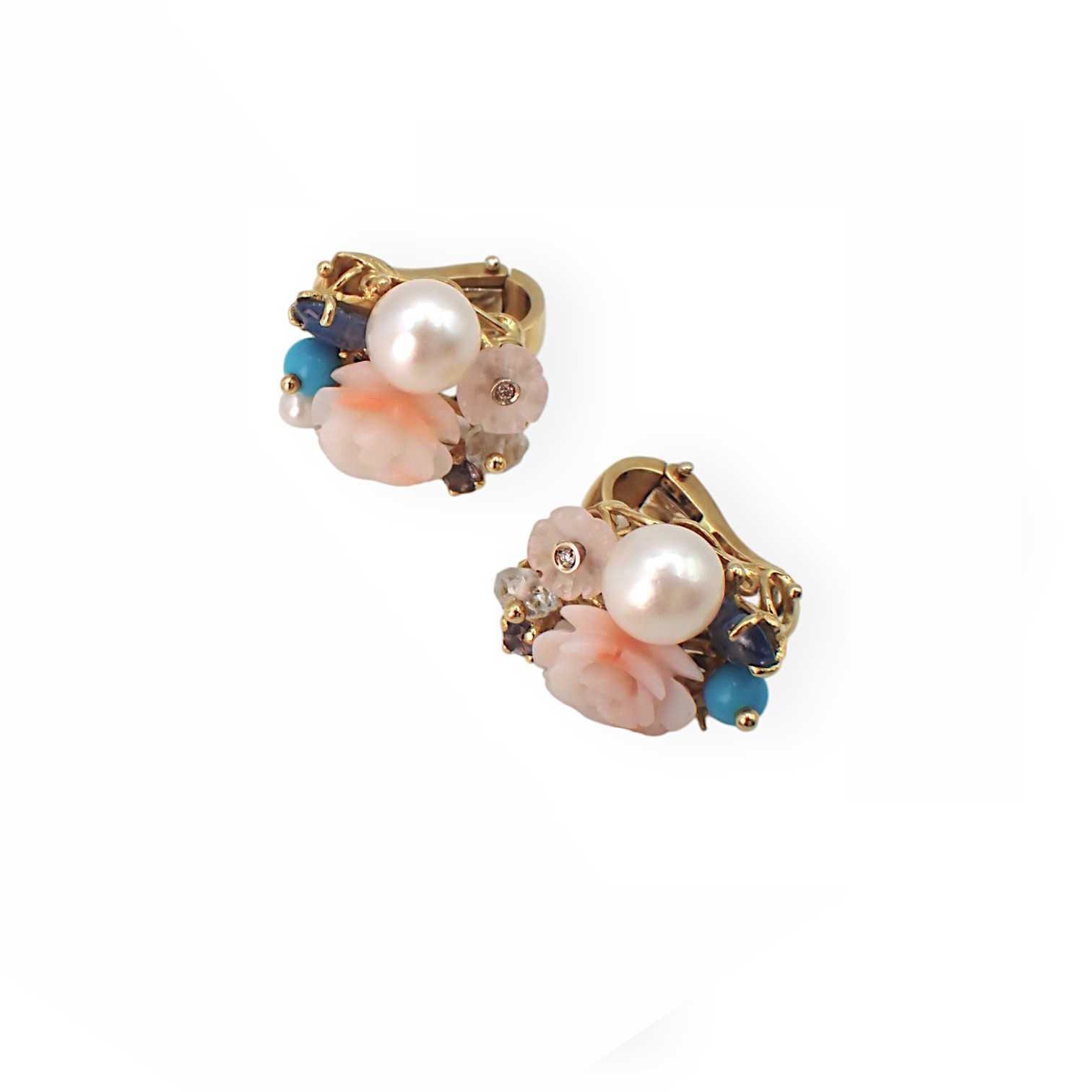 Orecchini firmati Santagostino in oro giallo con bouquet multicolor ( zaffiri, acquamarina, corallo, perle, quarzo rosa e turchese). Corredati di garazìnzia originale