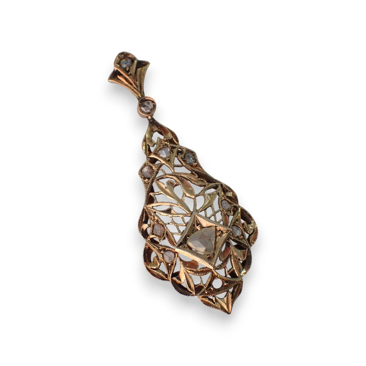Pendente decò traforato in oro basso titolo con diamanti taglio rosetta