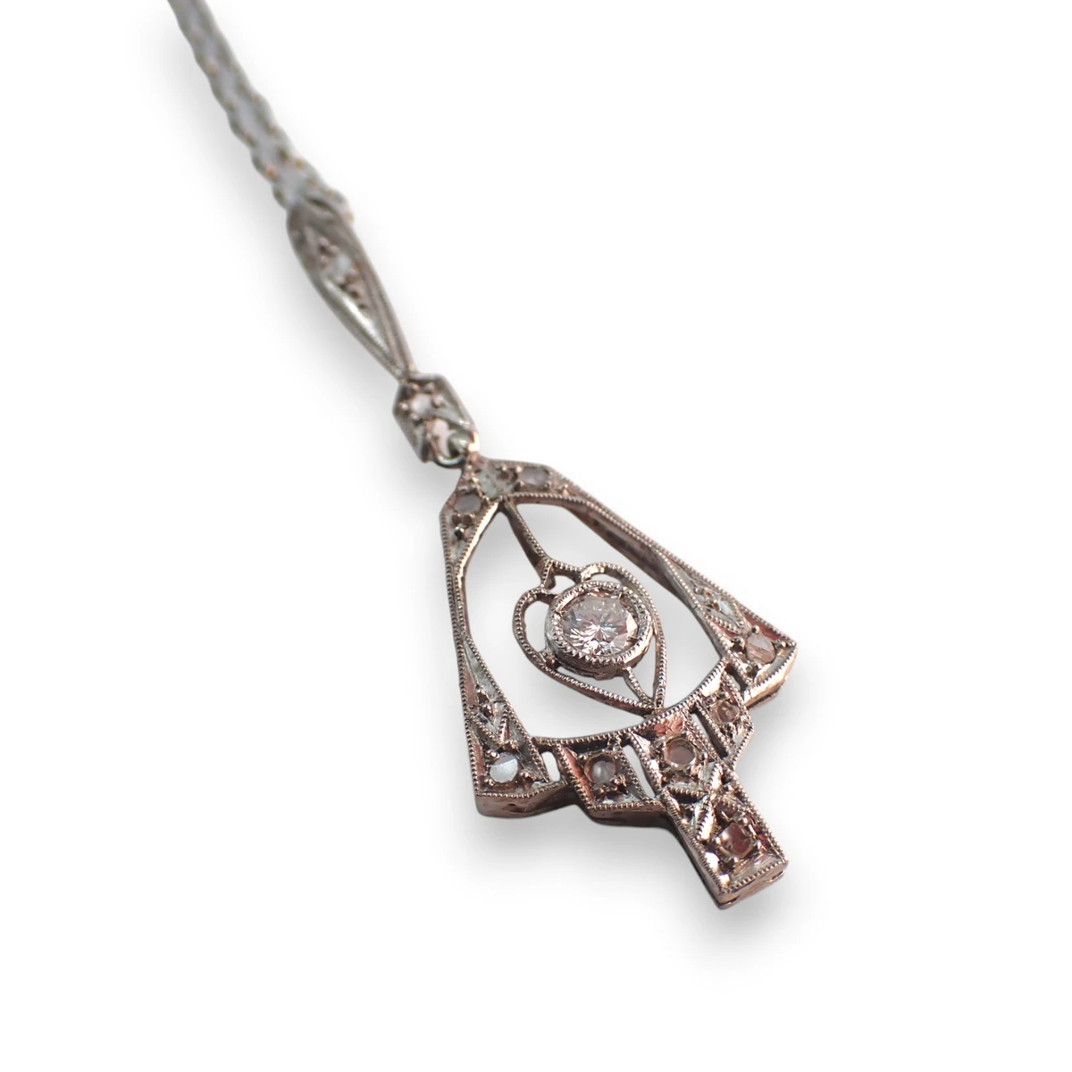 Pendente decò in oro bianco con diamanti taglio antico circa 0,11 ct contornato da diamanti taglio rosetta