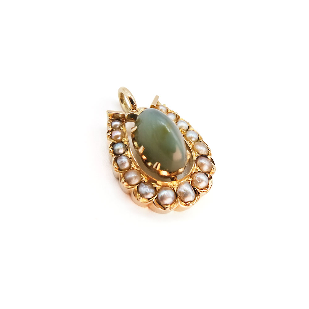 Pendente a ferro di cavallo in oro giallo con crisoberillo gatteggiante cabochon e microperle