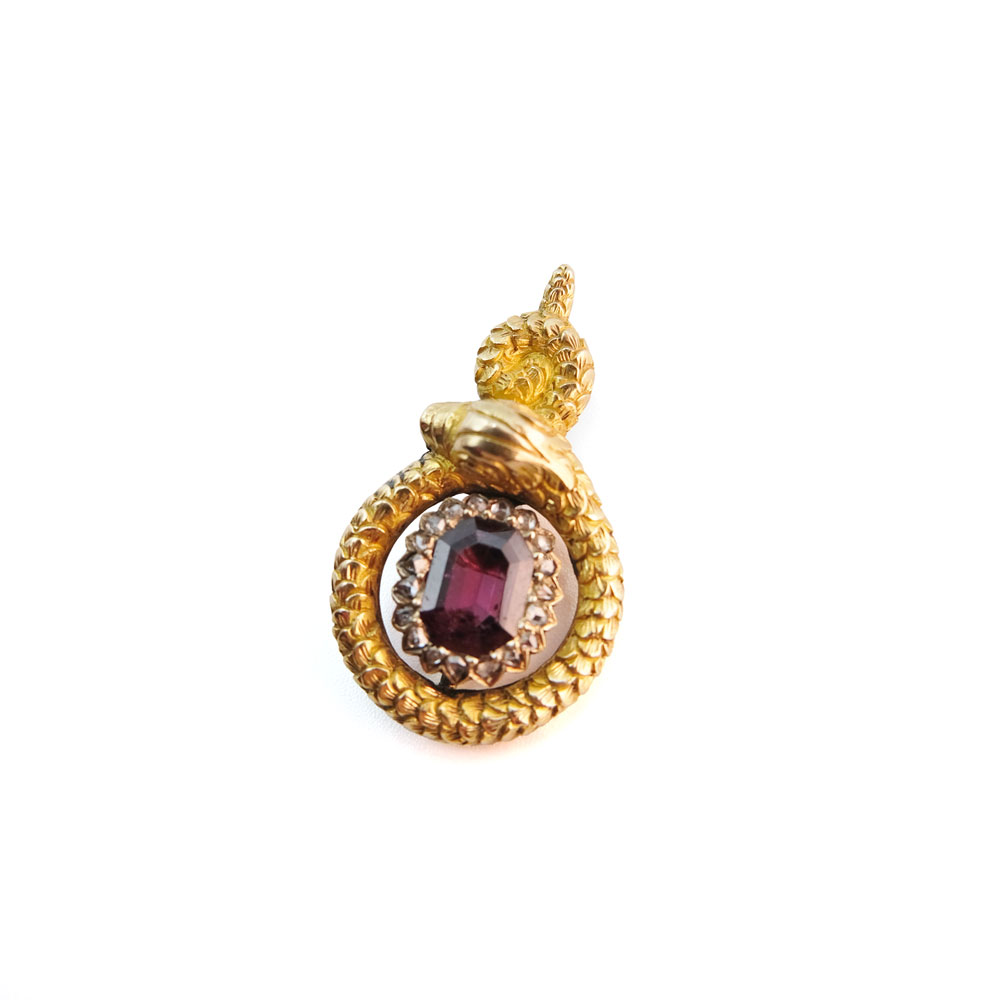 Pendente serpente in oro giallo e argento con granato centrale di circa 1,20 ct e diamanti taglio rosetta