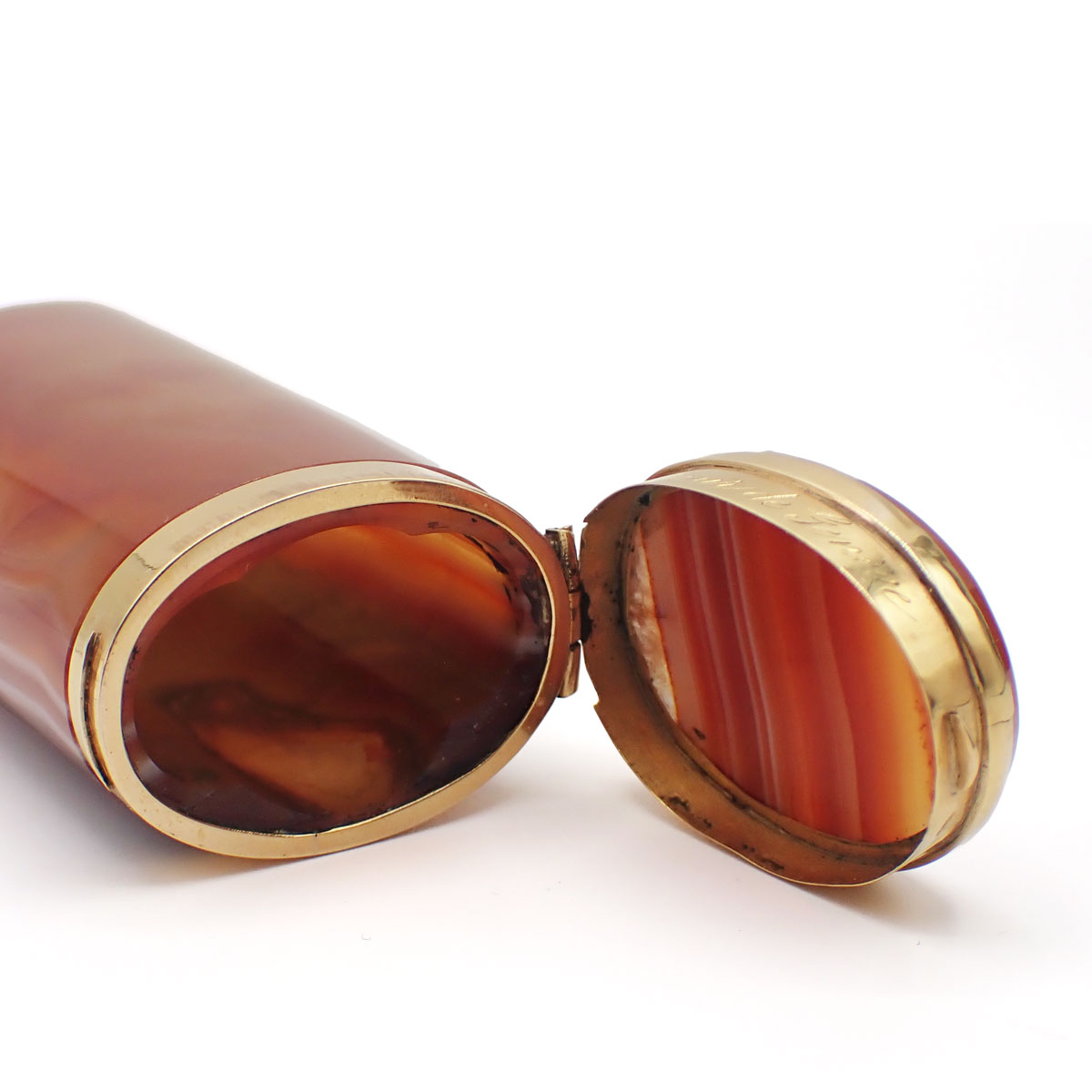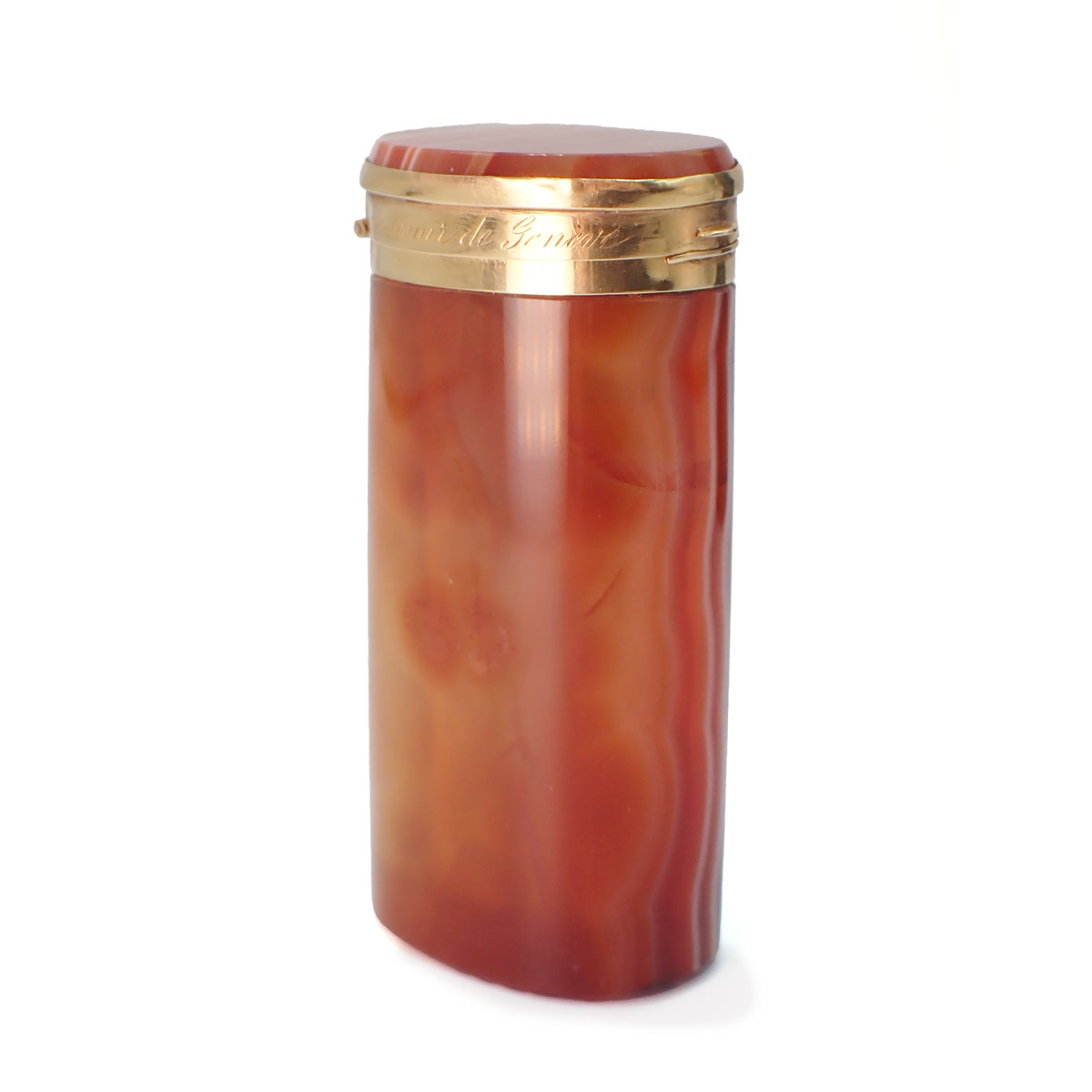 Portasigarette in oro giallo 750 e agata. Incisione esterna “1873 Fevrier L.B. Souvenir de Geneve”