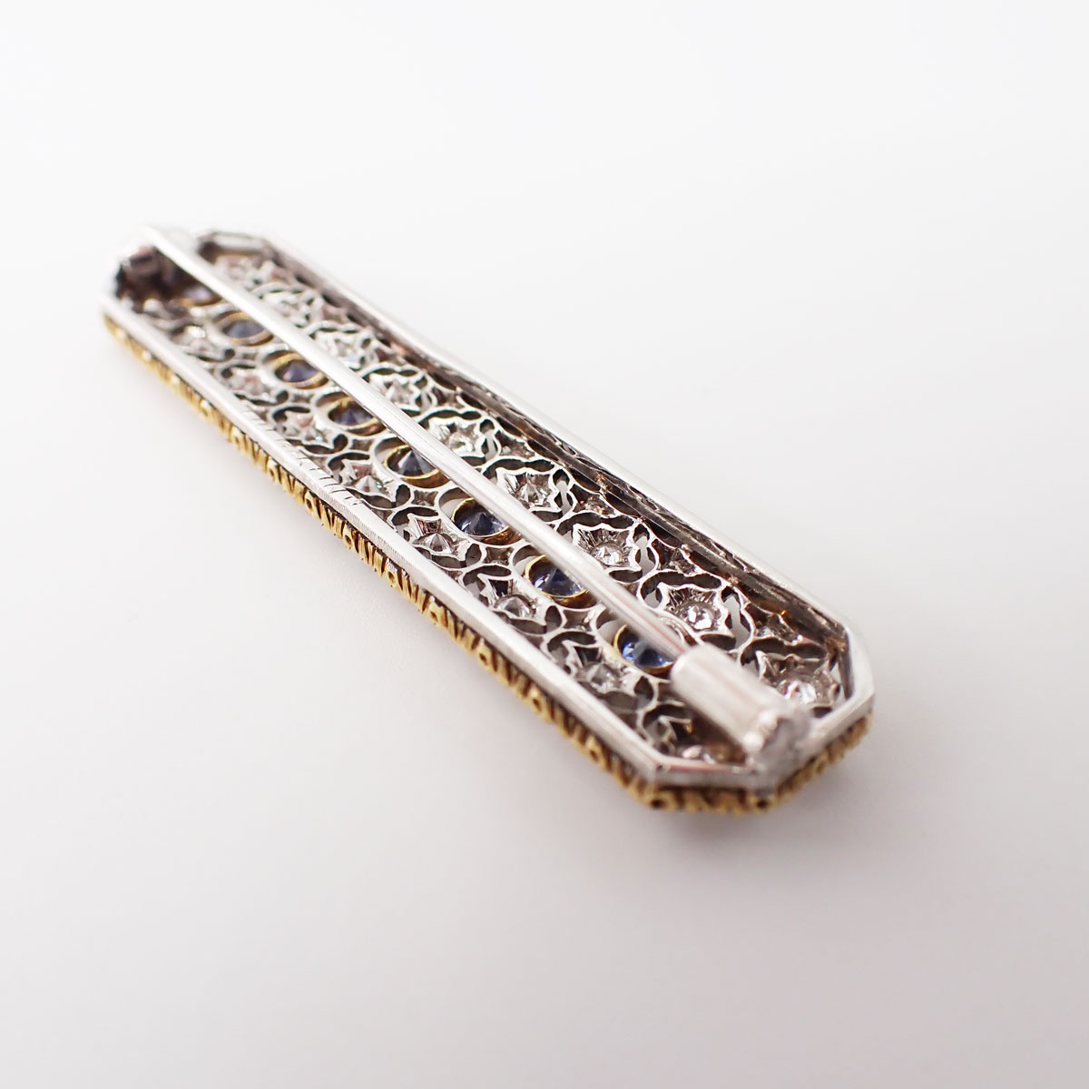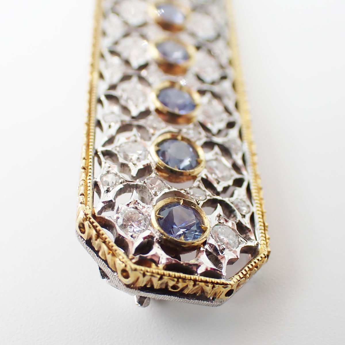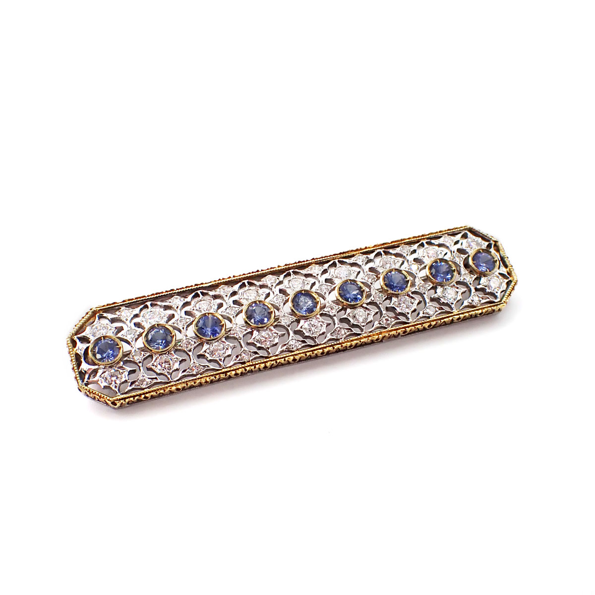 Spilla barretta in oro giallo e bianco 750 con pavè di zaffiri e diamanti taglio huit huit per un peso complessivo di circa 1,60 ct . Realizzata dai F.lli Martino con fine lavorazione a traforo e incisione a bulino