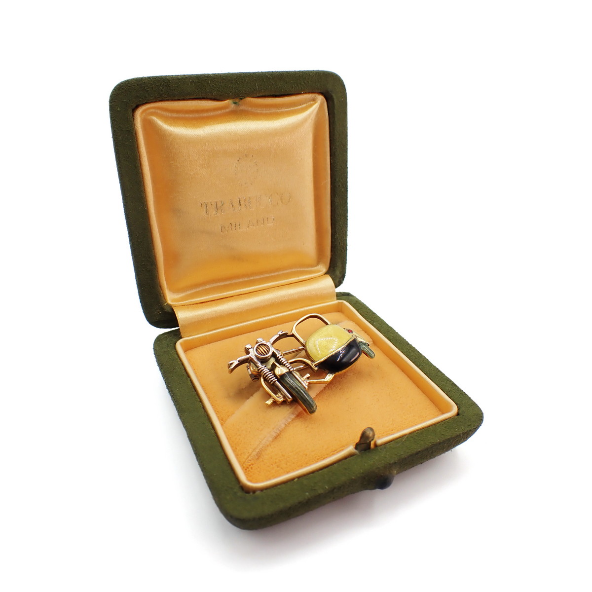 Spilla realizzata da Trabucco Milano a forma di Sidecar in oro giallo e smalti